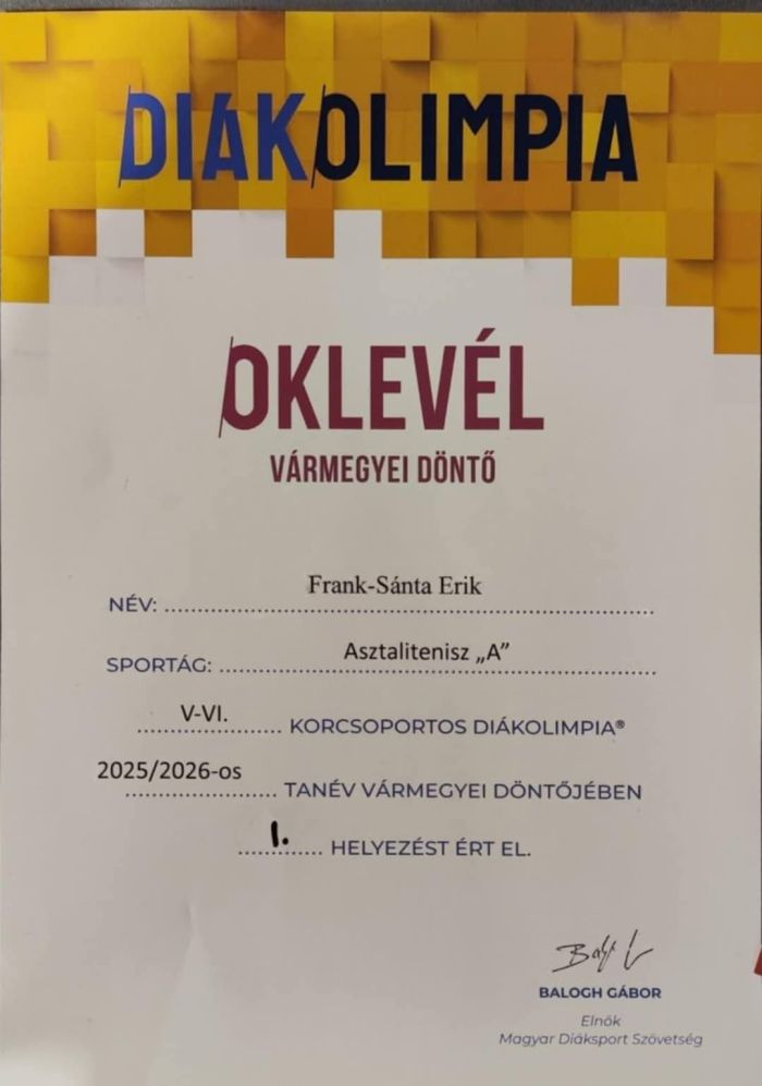 Őszi szünet előtti napokban rendezték meg a Bács-Kiskun vármegyei Asztalitenisz diákolimpiát Kiskunmajsán. Iskolánkat Frank-Sánta Erik 11.A osztályos tanuló képviselte az "A" kategória V-VI. korcsoportban. Erik kiemelkedő teljesítménnyel megnyerte a vármegyei döntőt, és továbbjutott az országos döntőbe.