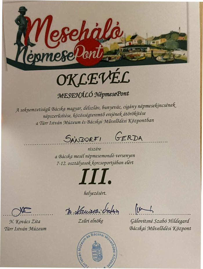 A hazai és határon túlról érkezett mesemondók között a 7-12. évfolyam kategóriájában iskolánk tanulója, Sándorfi Gerda (8. a) III. helyezést ért el A pletykás asszonyok című mesével. Felkészítő tanára Tamaskó Katalin.