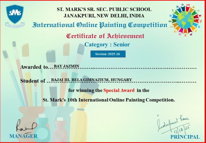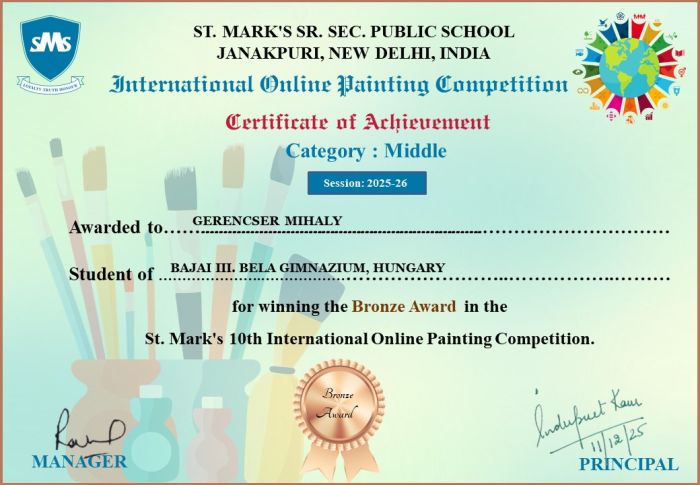 A tanév során a Bajai III. Béla Gimnázium tanulói ismét bekapcsolódtak az indiai (Mumbai) Szent Márk Iskola által meghirdetett online rajzpályázatba. A nemzetközi megmérettetésre közel 600 pályamunka érkezett 47 iskolából, 17 különböző országból, Európát többek között Litvánia, Horvátország, Csehország, Hollandia, Lengyelország, Dánia és Törökország is képviselte.