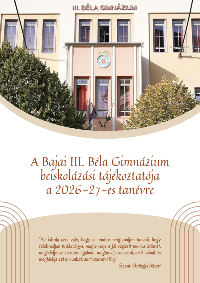 Szeptember 17-én rendezte meg a Bajai III. Béla Gimnázium magyar nyelv és irodalom munkaközössége az Édes anyanyelvünk nyelvhasználati verseny Bács-Kiskun vármegyei döntőjét. A Kazinczy-díj Alapítvány és az Anyanyelvápolók Szövetsége által kiírt versenyen a középiskolások először egy komplex nyelvi feladatsort oldottak meg, majd négy téma közül kellett választaniuk egyet, melyet háromperces időkeretben fejtettek ki a zsűri előtt.